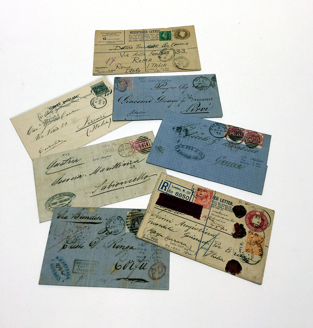 [GRAN BRETAGNA STORIA POSTALE] 1865/1948 Lotto di 7 lettere e cartoline con destinazioni o transito in Italia, notata 1 cartolina con francobollo di Gibilterra soprastampato "Morocco Agencies". Da esaminare. Covers