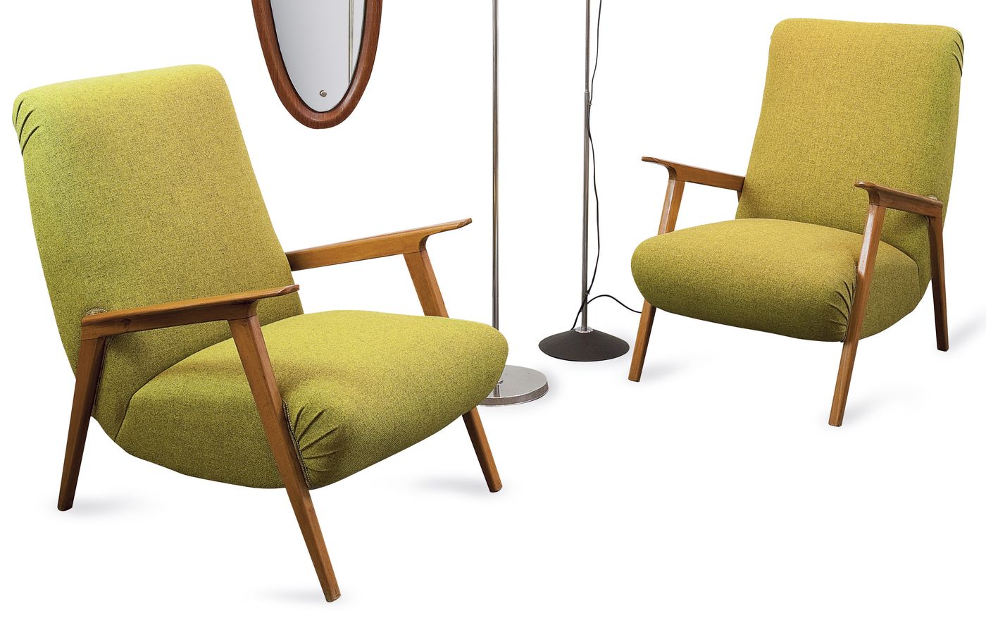 POLTRONE - Coppia di poltrone in legno di faggio, rivestimento in tessuto. Rinnovate con tessuto d'epoca. 1955 circa.