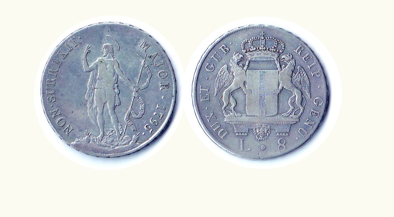 GENOVA - Dogi Biennali - 8 Lire 1795 - Stemma nuovo; D/ Stemma coronato tra 2 grifoni all'esergo, L*8; R/ S. G.Battista predicante - Lun.364. Metallo: AR - Conservazione: q.BB