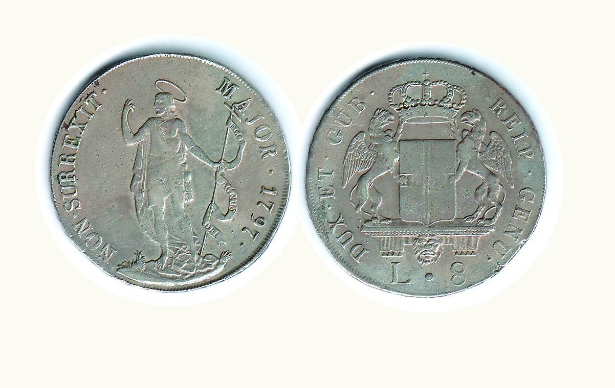 GENOVA - Dogi Biennali - 8 Lire 1797 - Stemma nuovo; D/ Stemma coronato tra grifi; R/ S. G. Battista predicante - Lun.364. Metallo: AR - Conservazione: BB