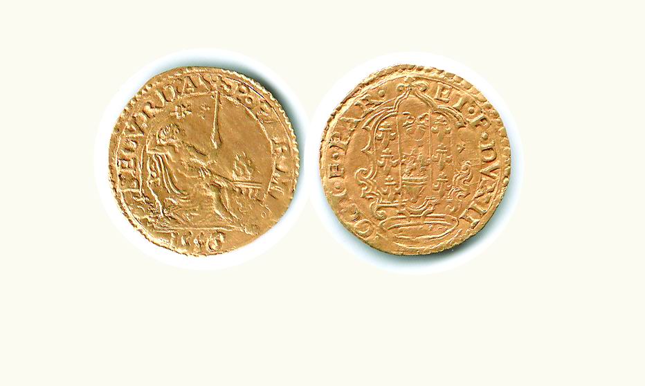 PARMA e Piacenza - Ottavio Farnese Duca II (1547-1586) - Scudo d'oro 1556: D/ Stemma in cartella coronata in cartocci; R/ La Sicurezza seduta a d. con mani alzate vicina a caminetto acceso - CNI 27 var. g.3,4. Rarità: RR - Metallo: AU - Conservazione: BB/