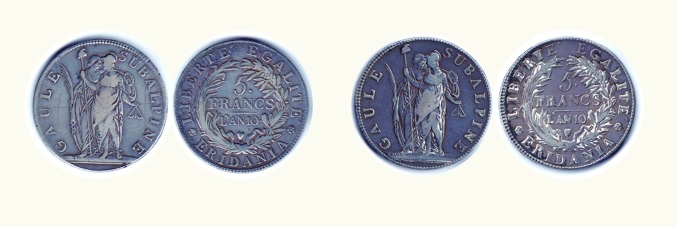TORINO - Repubblica Subalpina - 5 Francs A.10 (1801) - 2 monete; D/ Due...
