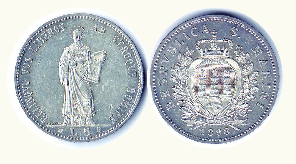 SAN MARINO - 5 Lire 1898 - P.357. Rarità: R - Conservazione: SPL+/FDC