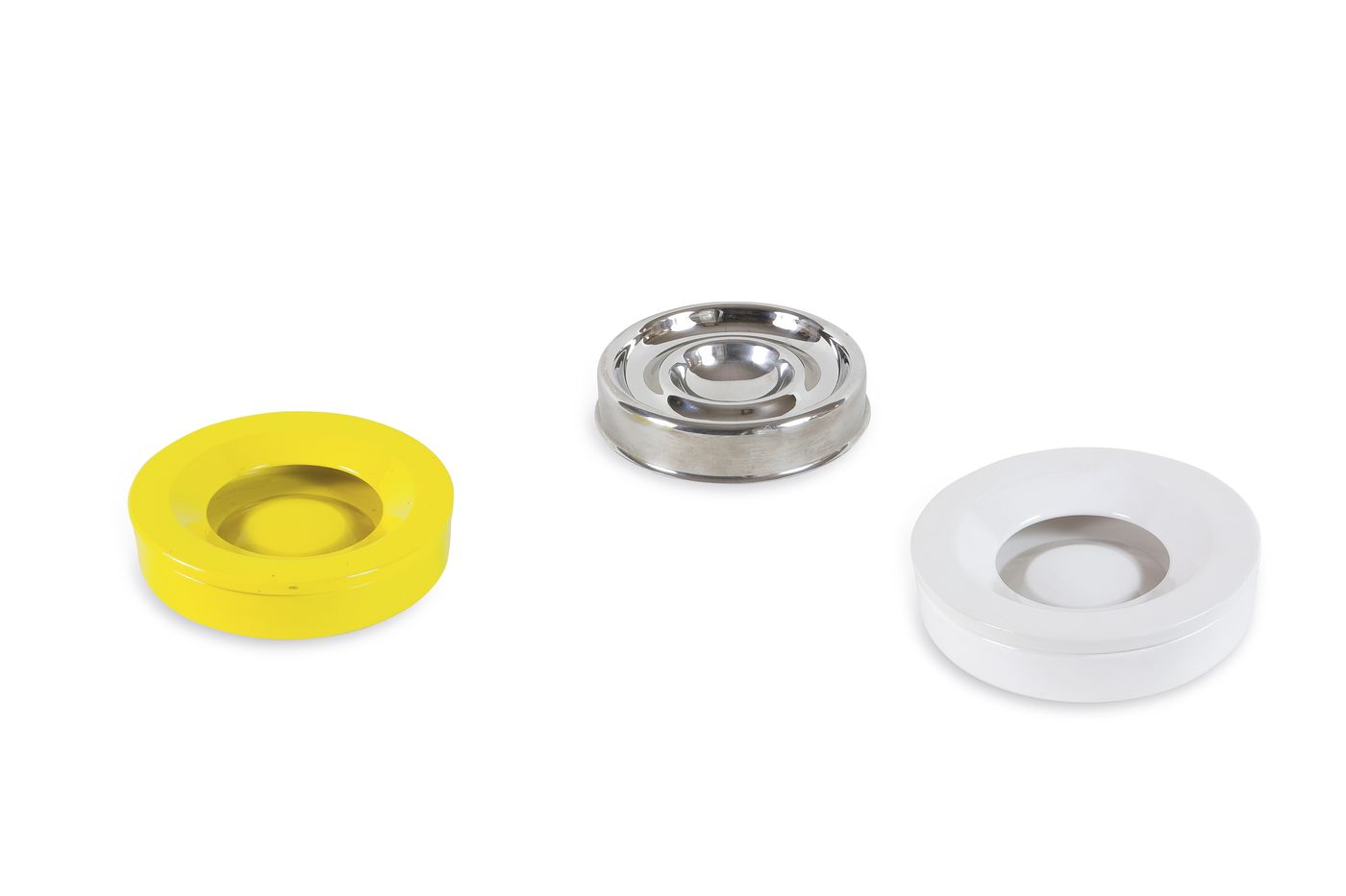 MANGIAROTTI ANGELO, MARI ENZO - Collezione di tre posaceneri. Ediz. Danese Milano. Due in ceramica disegnati da Mangiarotti uno di Enzo Mari in acciaio inox. Marchi del produttore alla base.