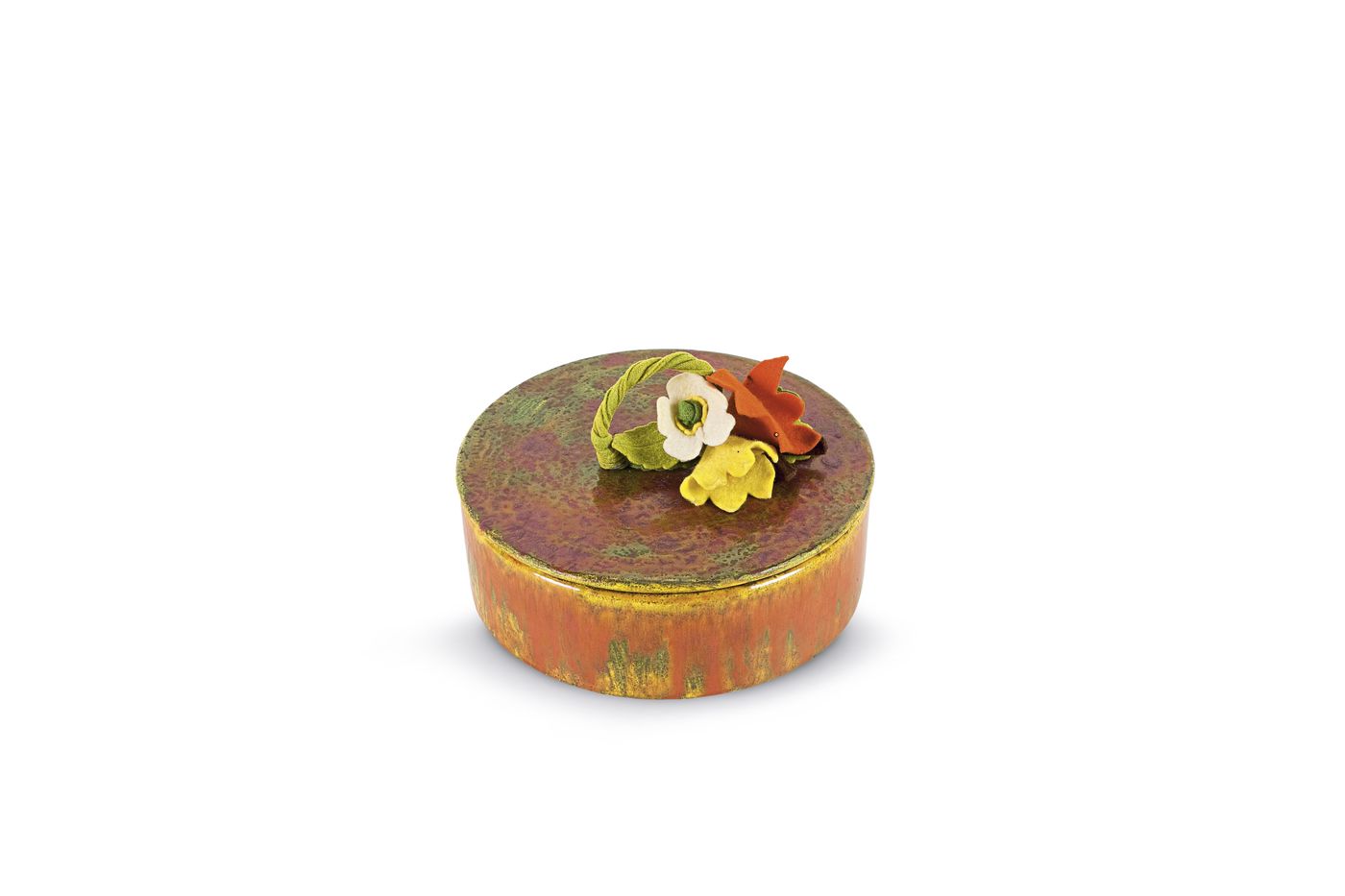 LENCI - Scatola con coperchio in ceramica. Manico in pannolenci. Marcata alla base Lenci, Torino, Made in Italy. Diam. cm. 18
