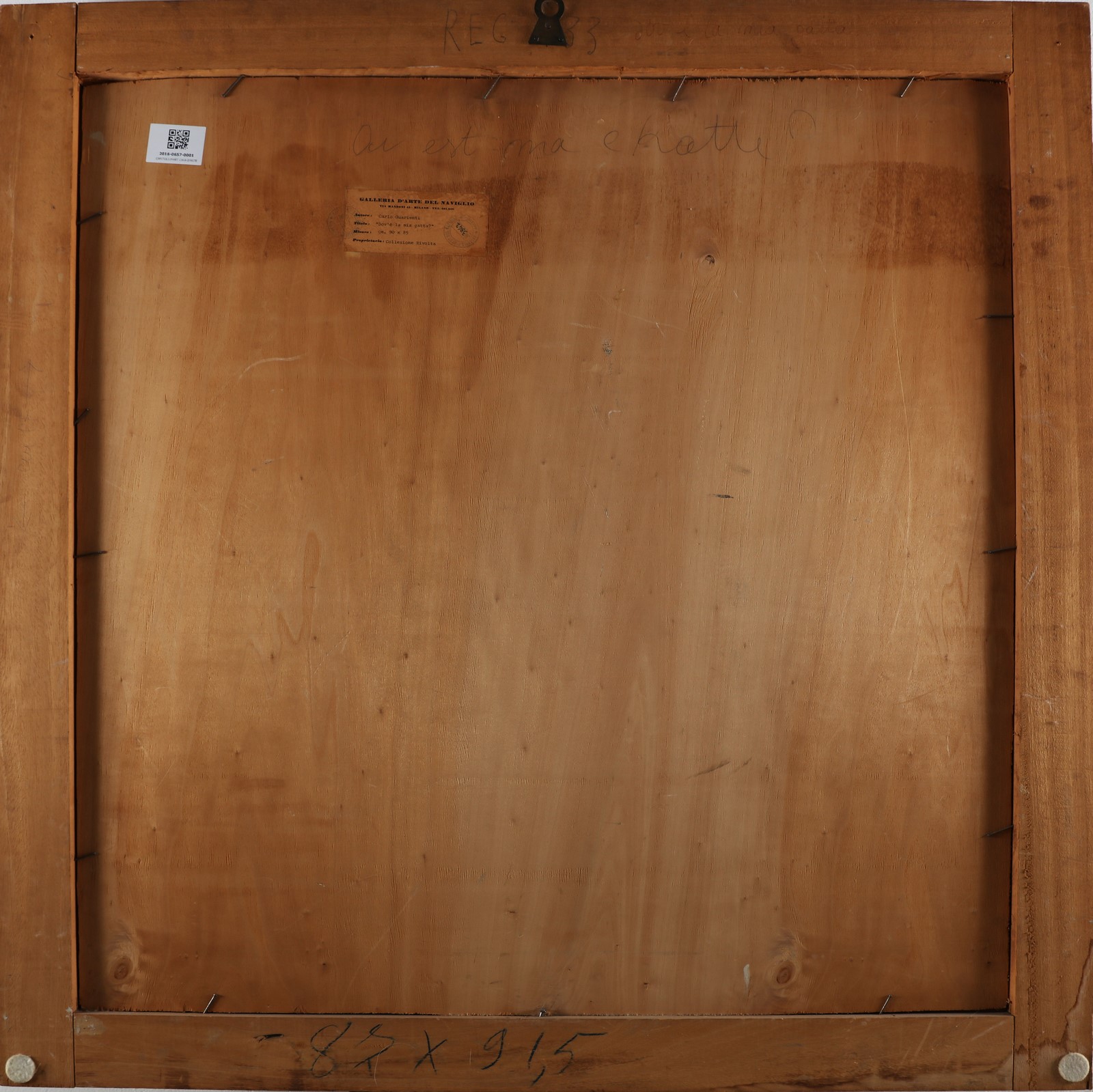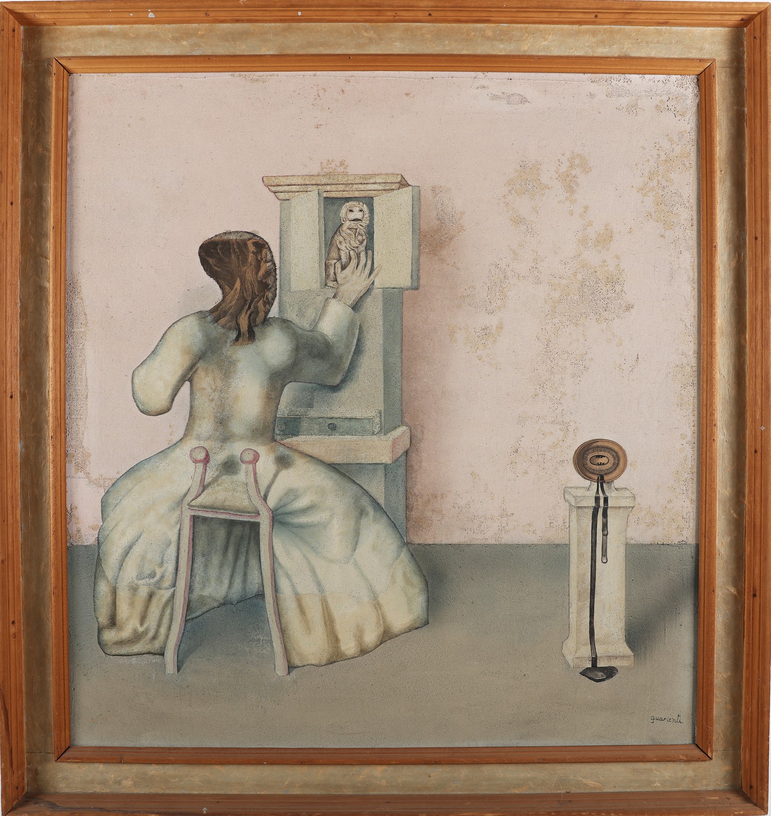 GUARIENTI CARLO (n. 1923) Dov'è la mia gatta?. Tecnica mista su tavola. Cm 85,00 x 90,00. Firma in basso a destra. Al retro cartiglio a cura della Galleria del Naviglio, Milano. Pubblicazione: Vittorio Sgarbi, Carlo Guarienti, Milano Fabbri Editori, 1985, p. 77 n. 17. . Cornice presente