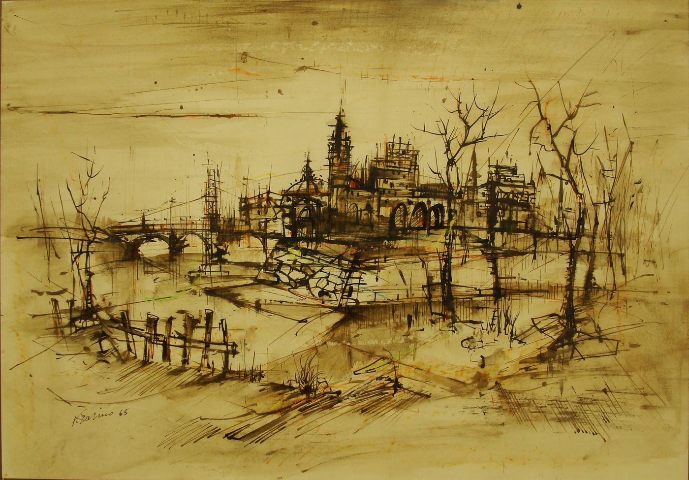 GARINO PIERO Leinì (TO) 1922 - 2009 Torino "Veduta invernale" 1965 35x50 tecnica mista su carta Opera firmata e datata in basso a sinistra