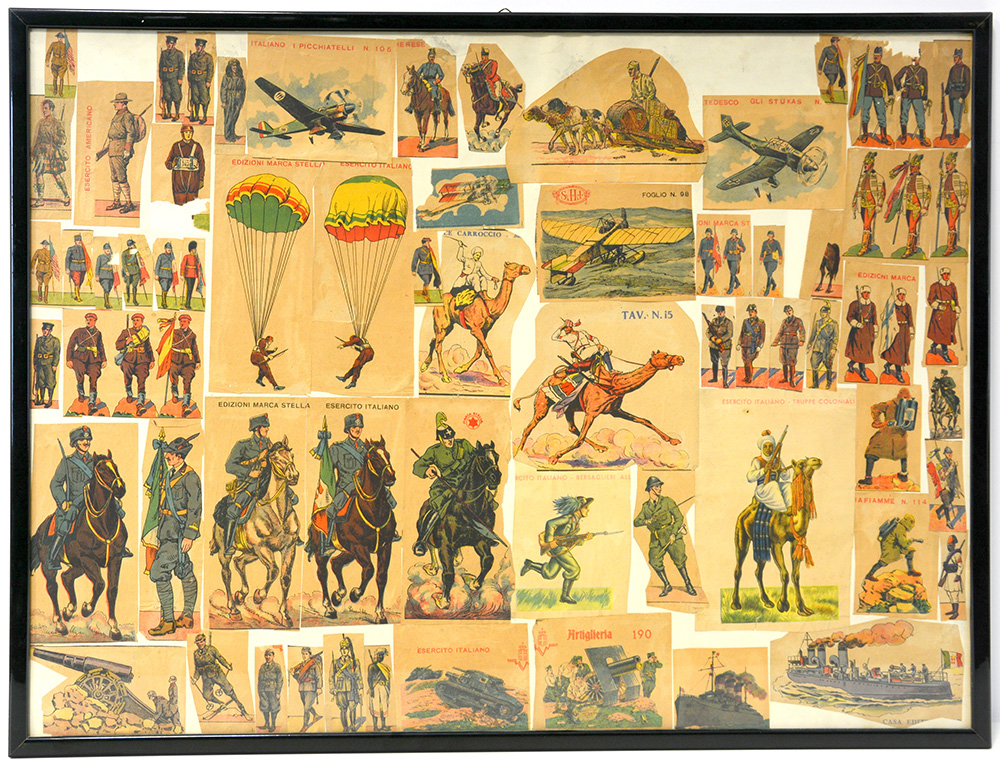 Grande pannello con applicati figurini militari in litografie a colori su carta. In cornice (difetti)
