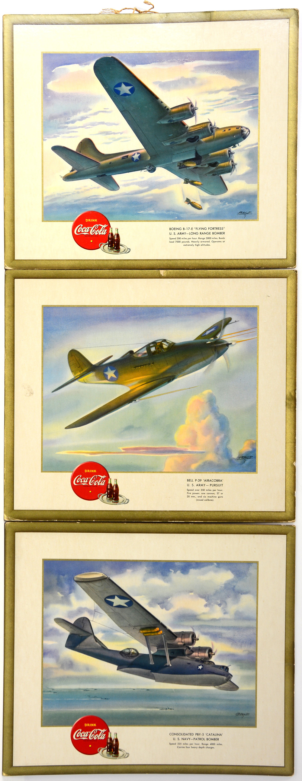Lotto di tre tavole pubblicitarie della CocaCola con raffigurati aeroplani dell'aviazione americana