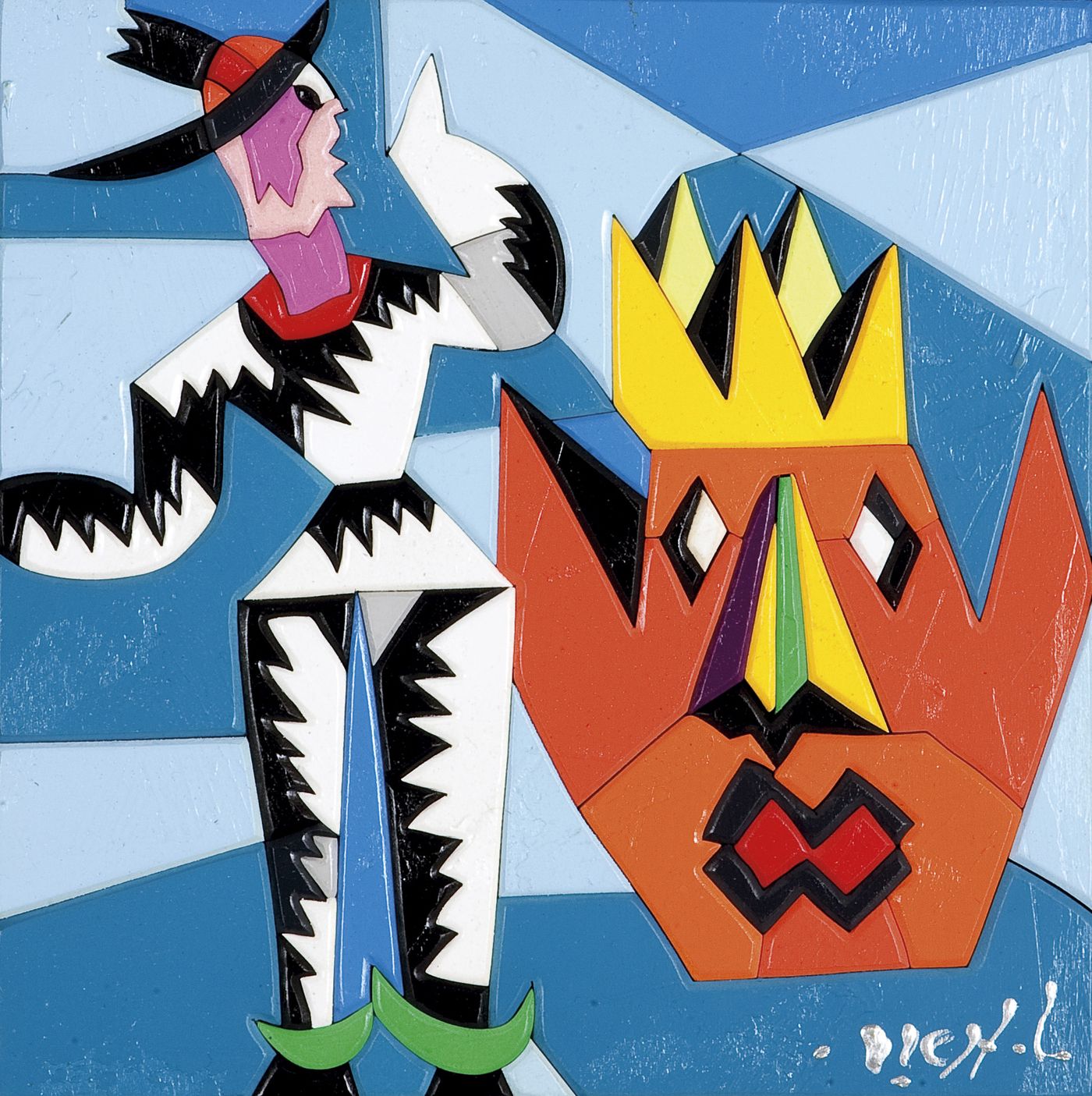 NESPOLO UGO Mosso Santa Maria (VC) 1941 "Oibò" 24x24 acrilici su tarsia lignea Opera firmata in basso a destra e al retro con titolo (timbro dell'atelier dell'artista) Autentica dell'artista su fotografia Opera archiviata presso l'archivio Nespolo con il n. 22476
