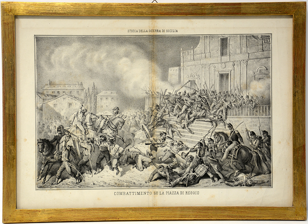 Lot 879 | Litografia (cm 24x37) raffigurante combattimento tra garibaldini ed esercito...