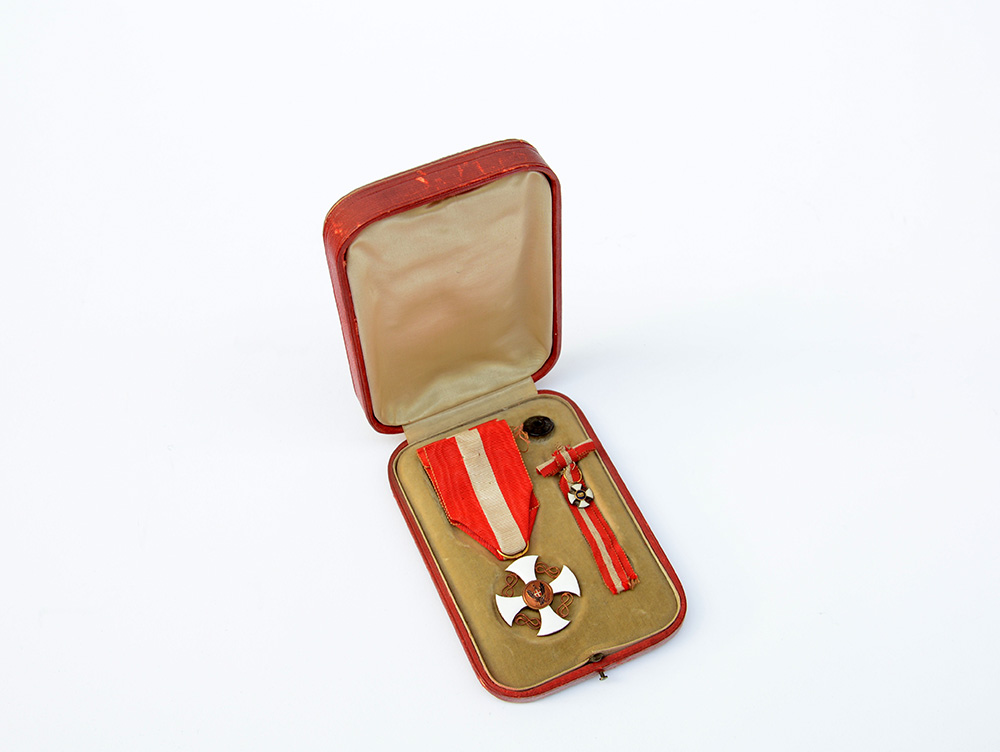 Onorificenza da cavaliere della Corona díItalia completa di nastro e mignon in argento dorato e smalti, in cofanetto di pelle monogrammato. Inizi del secolo XX