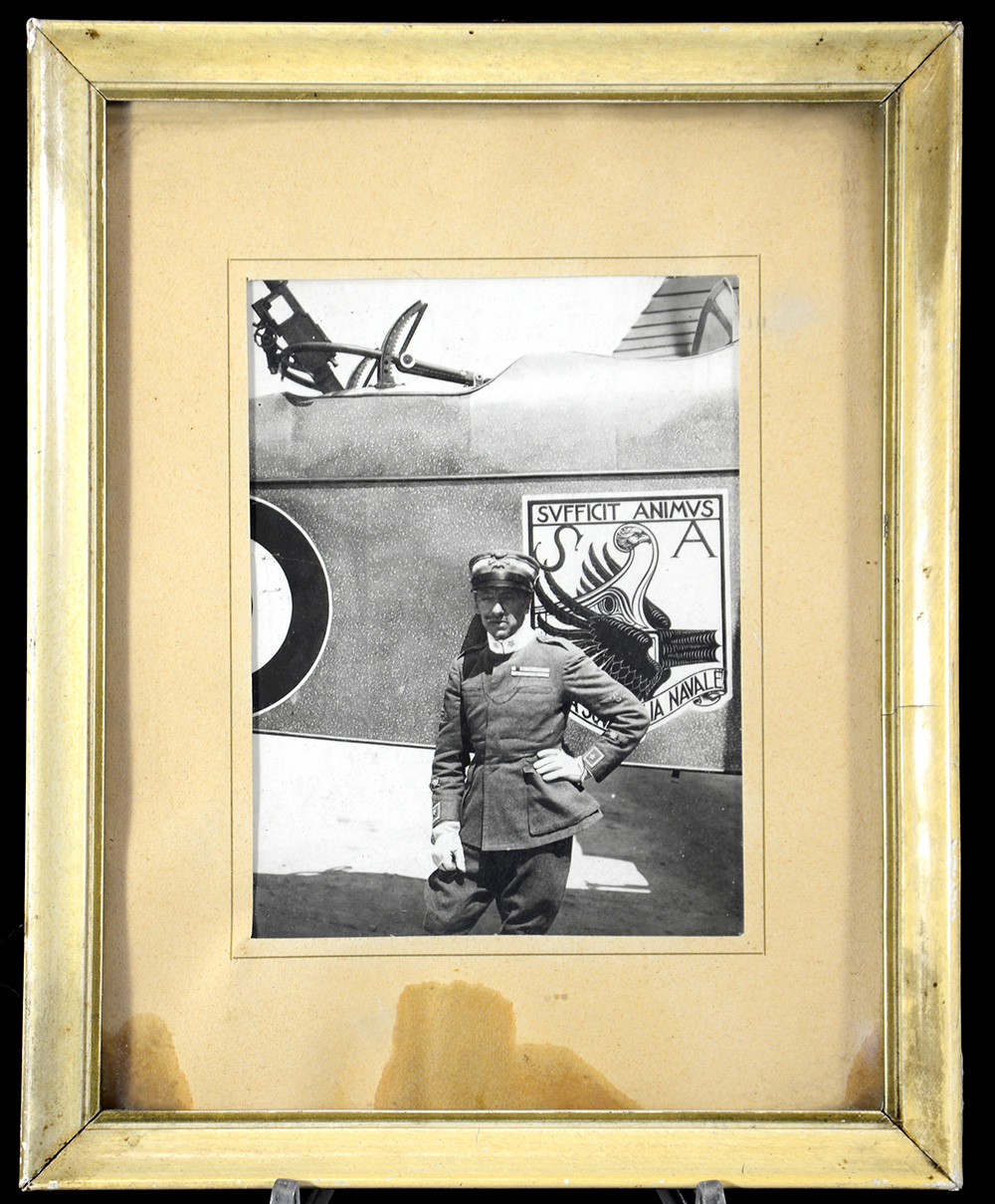 Fotografia dell'epoca raffigurante Gabriele D'Annunzio davanti al biplano SIA 9b (cm 13x10)