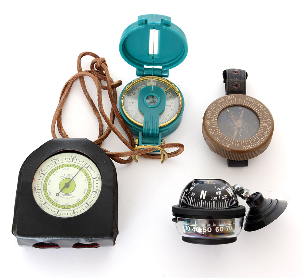 Lotto composto da un altimetro-barometro con bussola, una bussola a giroscopio, una bussola da rilevamento e una bussola da polso dell'esercito americano