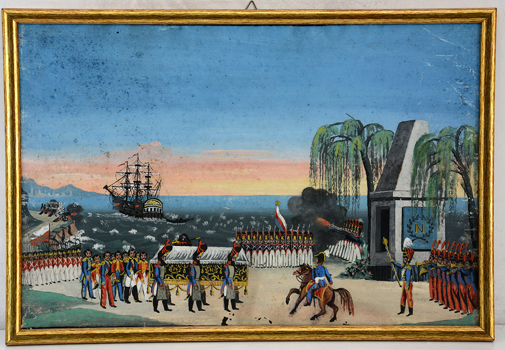 Acquerello (cm 30x45) di fattura popolare raffigurante il ritorno in patria dall'Isola di S. Elena della salma di Napoleone I imperatore dei francesi. A retro visibile bozzetto a mina di piombo con impostazione differente da quella del fronte. I met‡ del XIX secolo