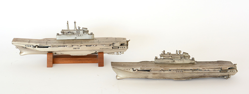 Lotto di due modelli navali della Marina Militare Italiana, di cui uno della nave Giuseppe Garibaldi. In metallo argentato (lunghezza cm 21)