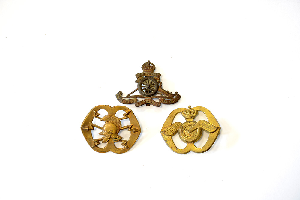 Lotto composto da tre distintivi metallici di reggimenti inglesi, II Guerra Mondiale