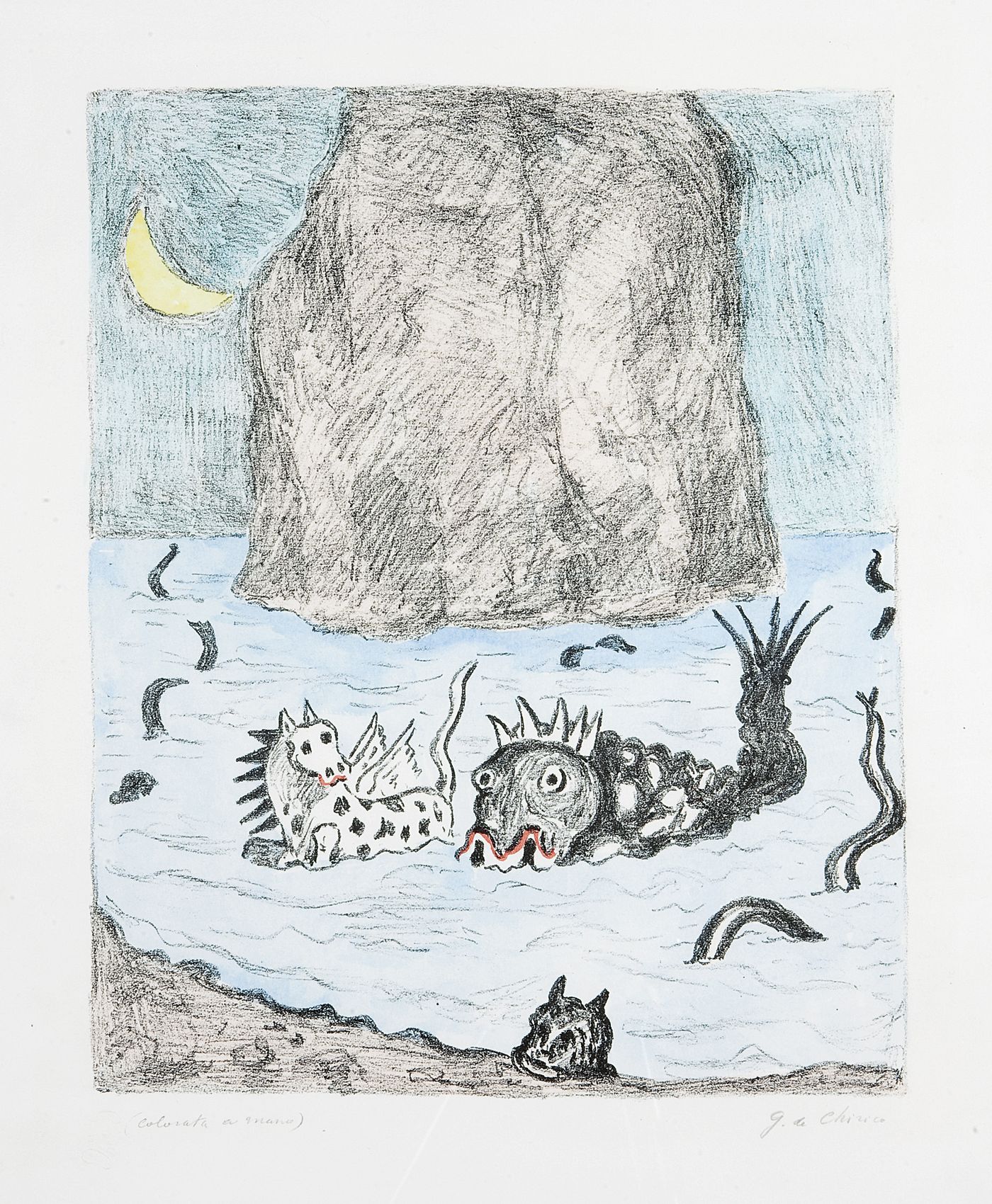 DE CHIRICO GIORGIO Volos 1888 - 1978 Roma "I mostri" 1973 70x50 foglio, 43x34 litografia eccezionalmente colorata a mano dall'artista Opera firmata in basso a destra (a matita) Dello stesso soggetto vennero eseguiti 99 esemplari numerati da 1/99 a 99/99; 20 esemplari numerati da I/XX a XX/XX; 20 esemplari su fondino carta China su Japon numerati da I/XX a XX/XX; 21 siglati dalle lettere A a Z e alcuni esemplari colorati a mano dall'artista Bibl.: "Giorgio de Chirico. Catalogo ragionato dell'opera grafica 1969-1977", pubbl. a pag. 198, n. 173