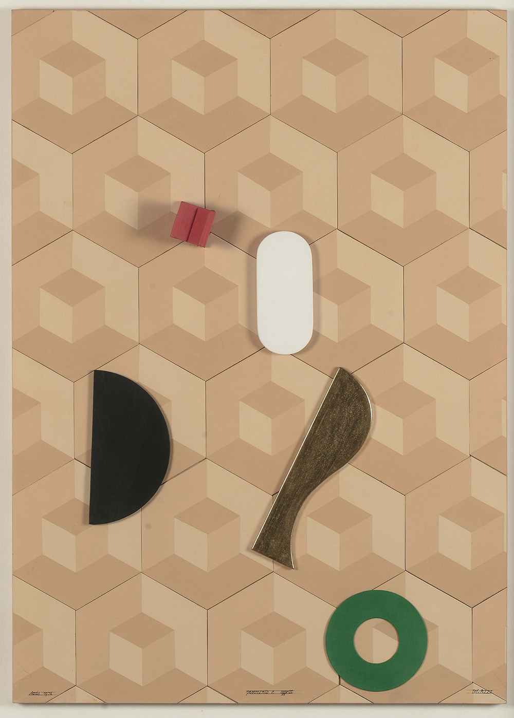 Pezzo Lucio Del (1933), Pavimento e oggetti, 1974, collage e tecnica mista su tavola, cm 52x71 datato, intitolato e firmato in basso