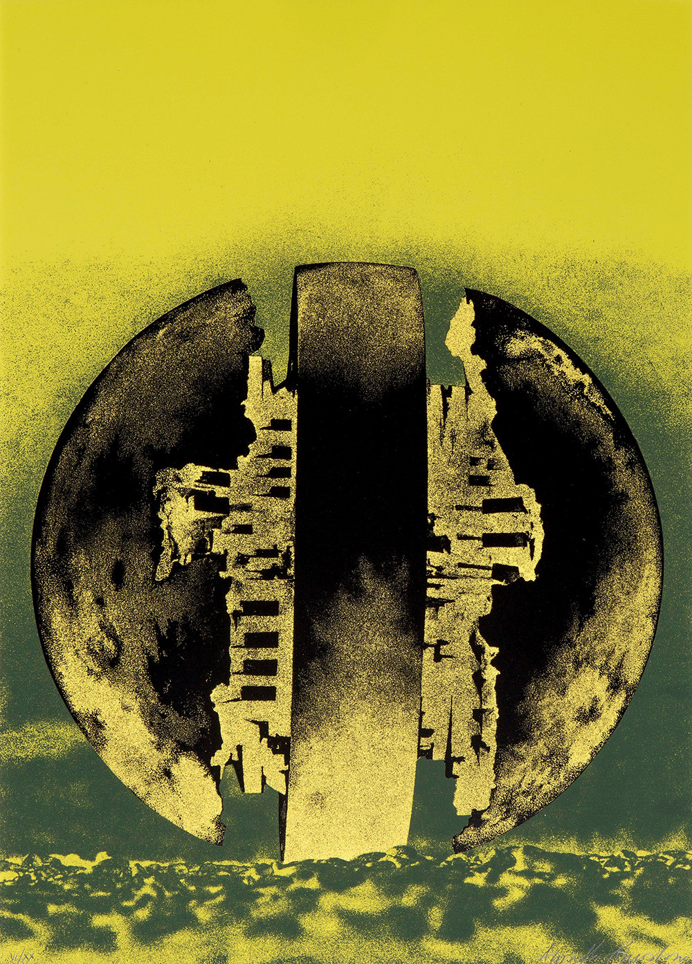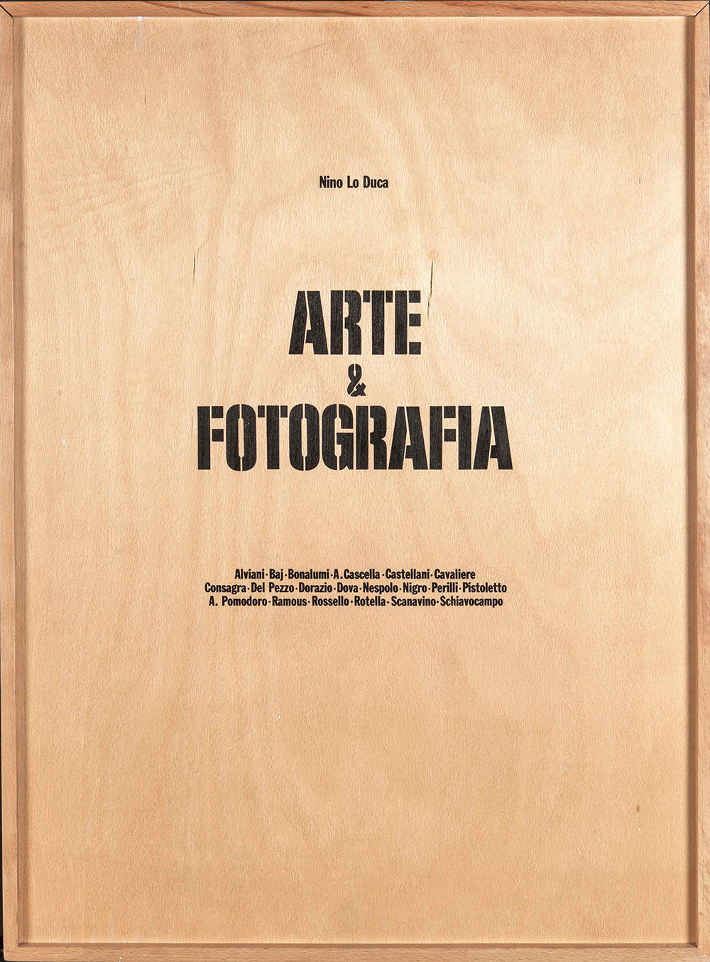 Nino Lo Duca (1940), Arte e Fotografia, 1976 (Alviani-Baj-Bonalumi-A.Cascella-Castellani-Cavaliere-Consagra-Del Pezzo-Dorazio-Dova-Nespolo-Nigro-Perilli-Pistoletto-A.Pomodoro-Ramous-Rossello-Rotella-Scanavino-Schiavocampo) , 20 litografie a colori di misure diverse corredate da un libro contenuti in un cofanetto in legno, cm 76x56,3x9 Es. VI/XX