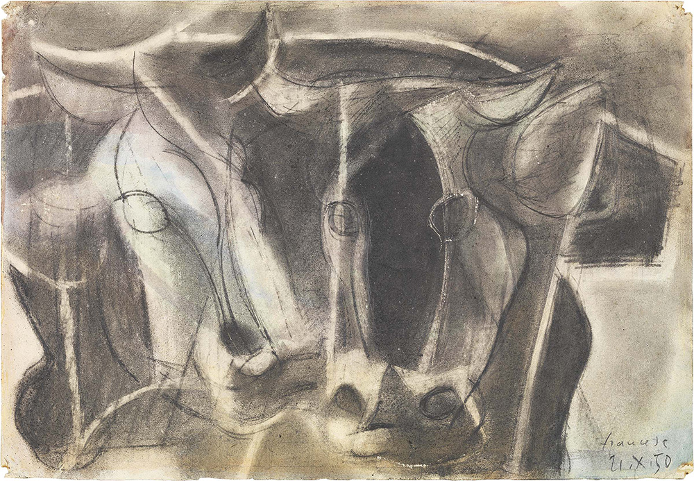Franco Francese Milano 1920 - 1996 Mucche, 1950 Tecnica mista su carta, cm. 33x47,6 Firma e data in basso a destra: Francese / 21.X.50