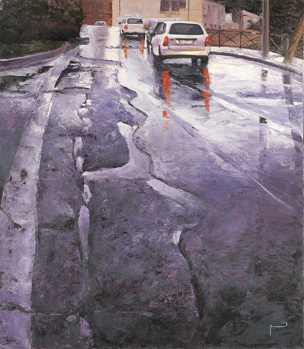 Davide Frisoni Rimini 1965 Asfalto viola Olio su tela, cm. 140x120 Firma in basso destra: Frisoni; titolo e firma al verso sulla tela: "Asfalto viola" / Frisoni; sul telaio: etichetta Galleria d'Arte "Pegaso", Forte dei Marmi