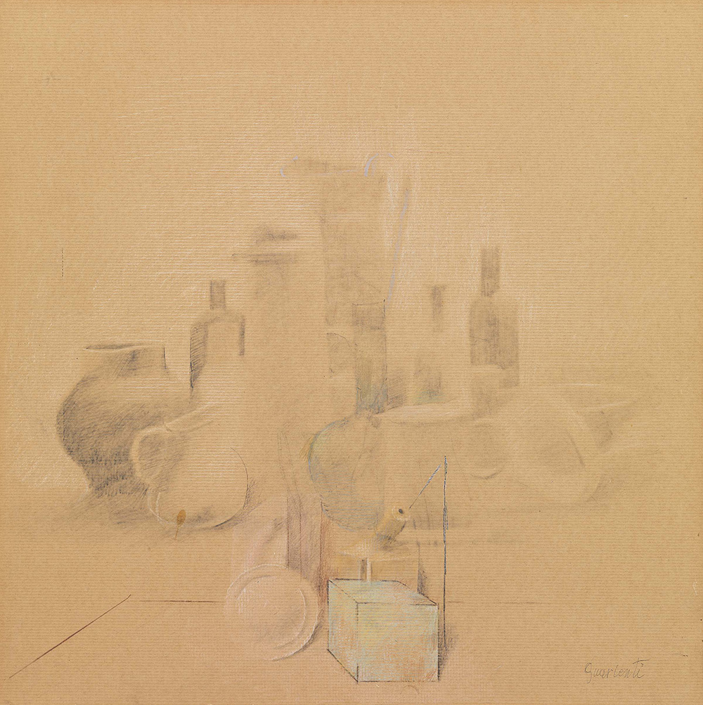 Carlo Guarienti Treviso 1923 Natura morta, 1998 Tecnica mista su cartone applicato su tavola, cm. 50,6x50,6 Firma in basso a destra: Guarienti. Foto autenticata dall'artista