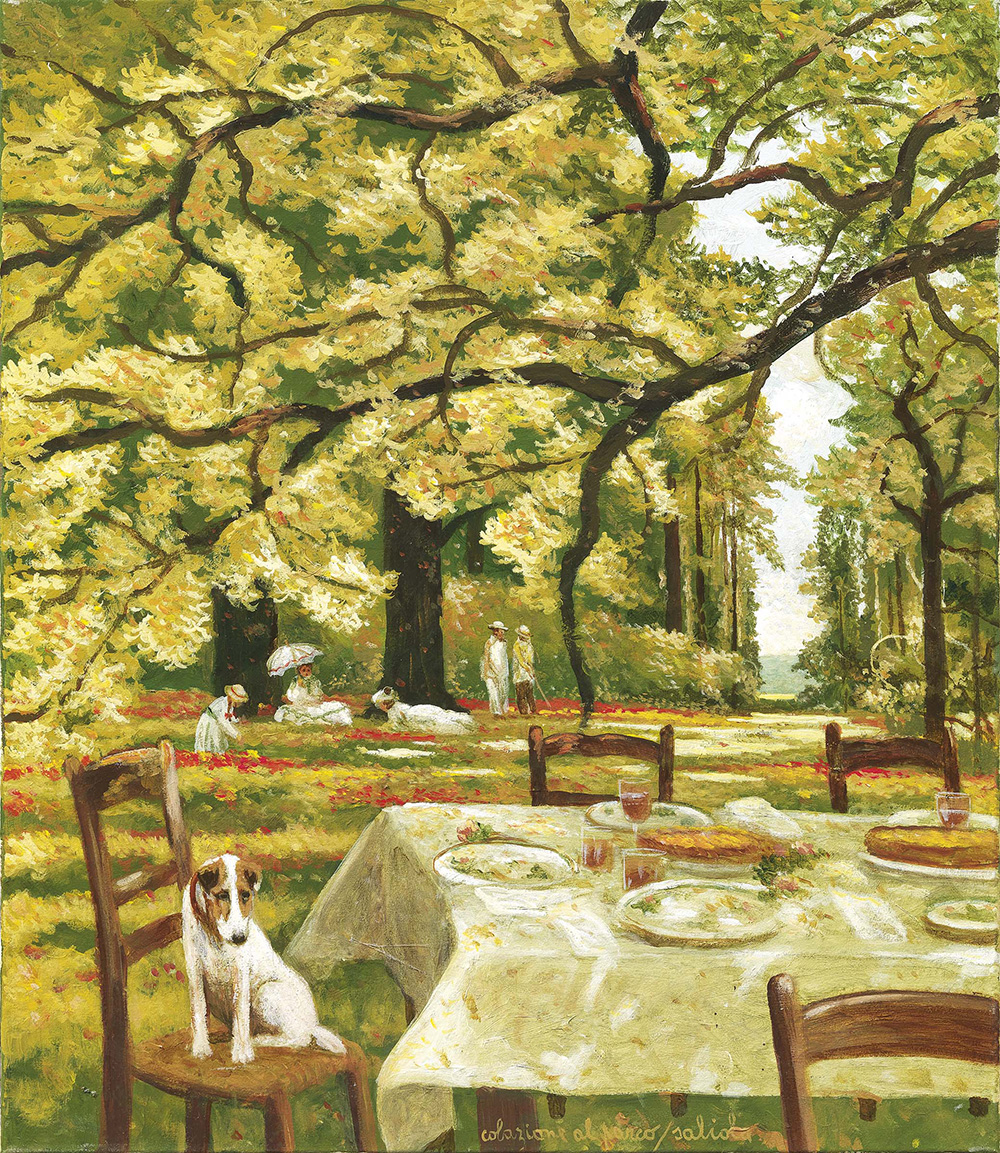 Antonio Saliola Bologna 1939 Colazione al parco, 1998 Olio su tela, cm. 70x60 Titolo e firma in basso verso destra: Colazione al parco / Saliola; al verso sulla tela firma, data e titolo: Antonio / Saliola / 1998 / Colazione al parco
