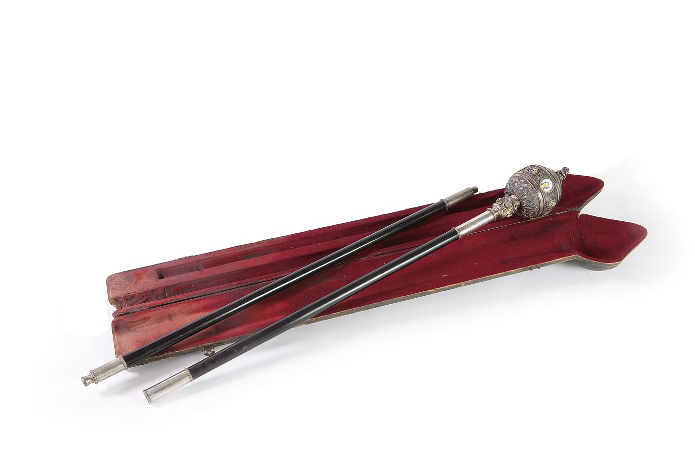 PASTORALE Bastone pastorale in legno di ebano ed argento; punta a forma di globo sbalzata e cesellata con angeli e volute vegetali; nella parte superiore una scultura raffigurante San Giovanni Battista fanciullo. Nel globo quattro ovali in porcellana dipinta con la raffigurazione di Santi e della Beata Vergine Reca scritta "Anno Domini 1800" Entro custodia originale