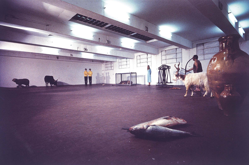 Claudio Abate Roma 1943 Gino De Domincis, lo Zodiaco, 1970 Fotografia a colori, cm. 69x103 Titolo, data, dedica e firma al verso, su un pannello di supporto: Lo Zodiaco 1970 / A Vettor Pisani / Claudio Abate. Foto scattata alla Galleria L'Attico, in occasione della performance di Gino de Dominicis, Roma, 4-7 aprile 1970