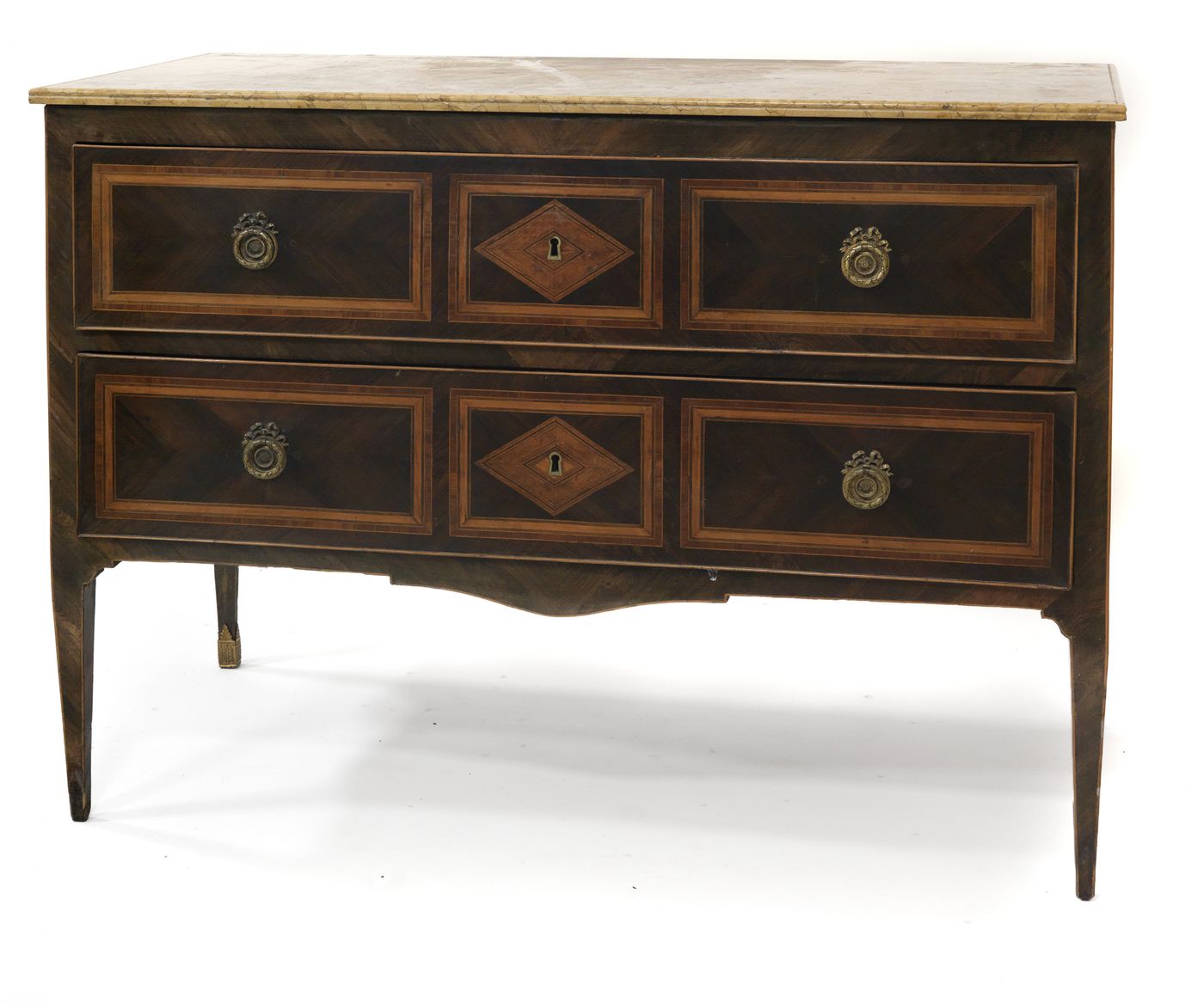 CASSETTONE Cassettone lastronato in palissandro ed intarsiato in legni chiari. Fronte a due cassetti, gambe piramidali, piano in marmo. Epoca, fine XVIII sec. cm 95x131x65 Difetti