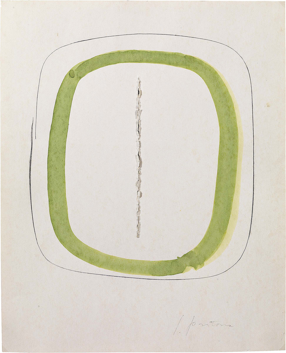 Lucio Fontana Rosario Santa Fè 1899 - Varese 1968 Concetto spaziale, 1961 Litografia con intervento a mano: gouache verde e strappo, cm. 47x37,8 Firma a matita sul margine in basso a destra: L. Fontana. Certificato su foto Fondazione Lucio Fontana, con n. 975/8 ex 1844/1. Litografia realizzata per il volume 40 disegni di Maestri Moderni, Edizioni d'Arte, Milano, 1961. Tiratura di 202 esemplari