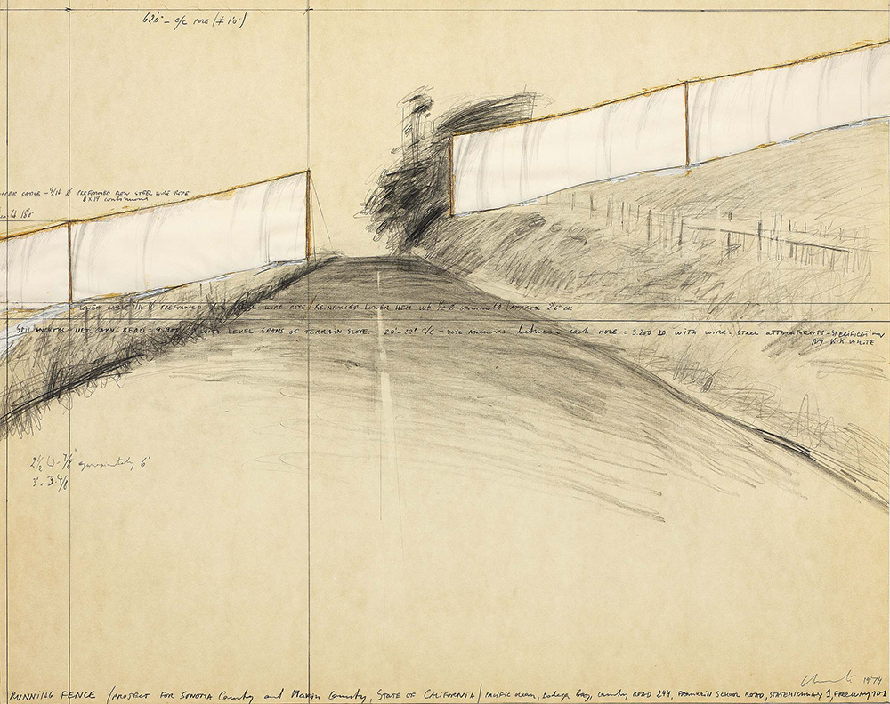 Christo Gabrovo 1935 Running Fence, 1974 Tecnica mista su cartoncino applicato su pannello, cm. 56x71 Firma e data in basso a destra: Christo 1974, titolo in basso: Running Fence (Project for Sonoma County and Marin County, State of California). Foto autenticata dall'artista in data 2007