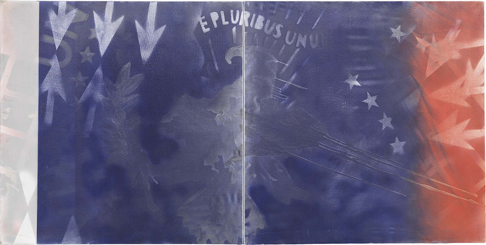 Franco Angeli Roma 1935 - 1988 Tutti gli imperialisti sono tigri di carta, 1965 Tecnica mista su tela con tulle bianco, cm. 100x200 Firma e titolo al verso sulla tela: (Franco Angeli) / "Tutti gli / imperialisti / sono / tigri di carta"; sul telaio: etichetta Comune di Paternò / Galleria d'Arte Moderna / Mostra Destini incrociati, con dati dell'opera: timbro ed etichetta parzialmente abrasa Studio d'Arte Condotti, Roma. Certificato su foto Archivio Franco Angeli, Roma, 12 luglio 2016, con n. P-110716/675
