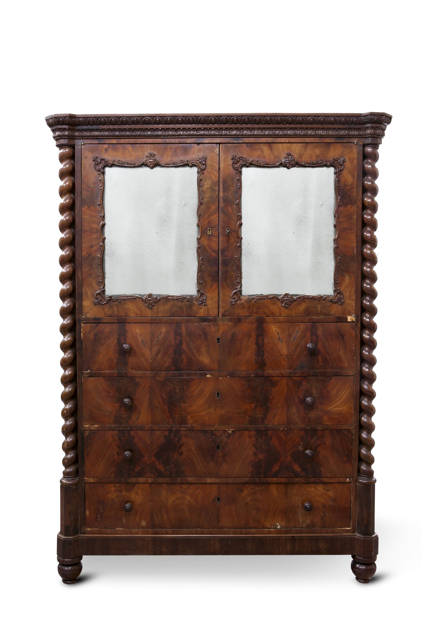 SECRETAIRE Secretaire lastronato in piuma di mogano. Parte superiore a due ante con specchi, interno a tre tiretti con intarsio in legno scuro. Parte inferiore a quattro cassetti. Due colonne tortili ai lati. Epoca, metà XIX secolo cm 181x122x56,5