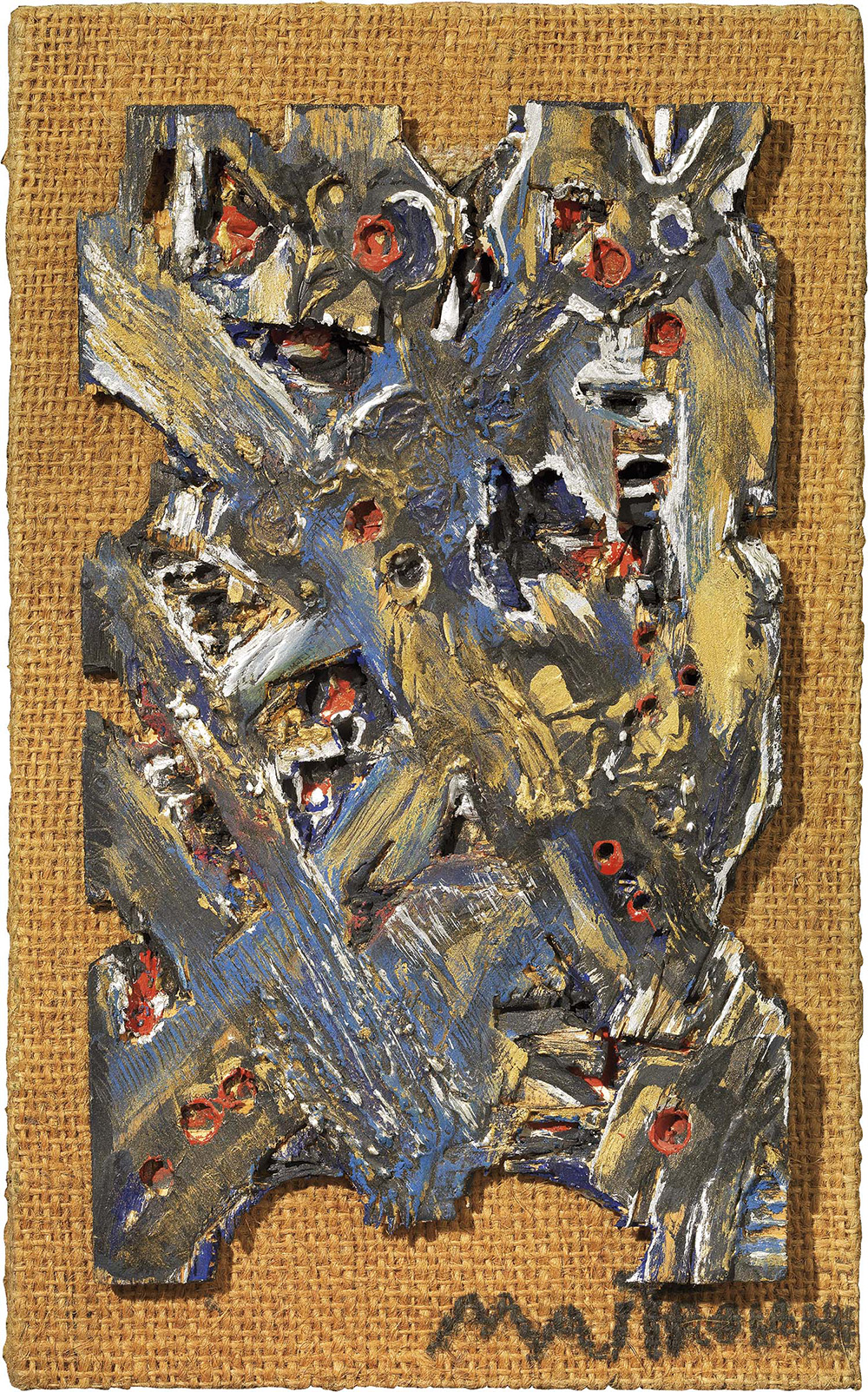 Umberto Mastroianni Fontana Liri (Fr) 1910 - Marino Laziale (Roma) 1998 Senza titolo Tecnica mista su legno applicato su tela, cm. 29,4x18 Firma in basso a destra: Mastroianni