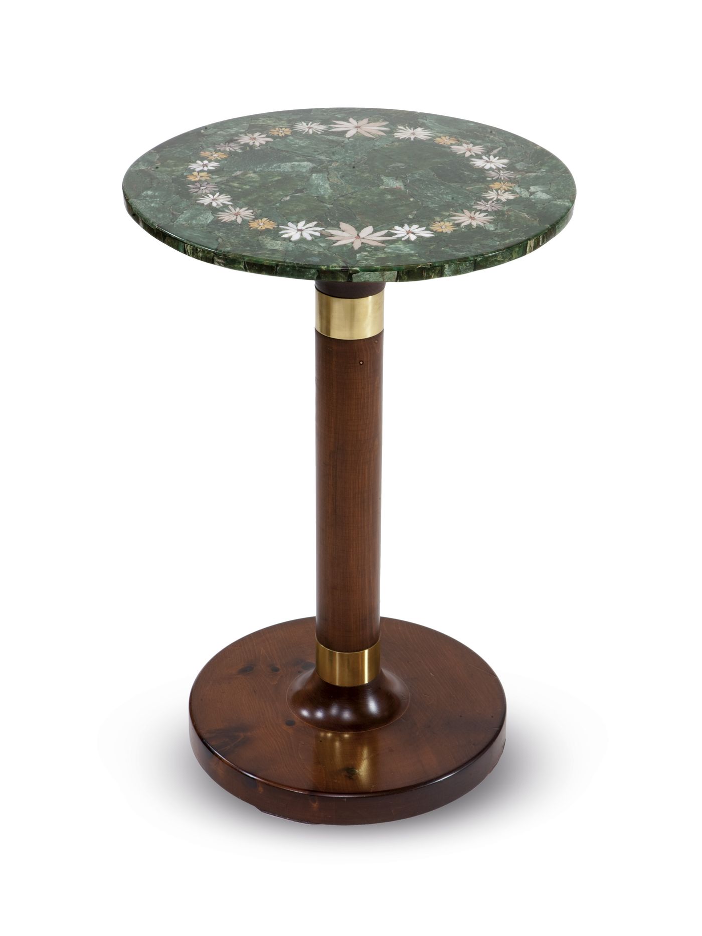 TAVOLINO Tavolino anni '70. Elemento centrale composto da colonna lignea; piano in marmo verde con inserti in micromosaico a fiori. h cm 73