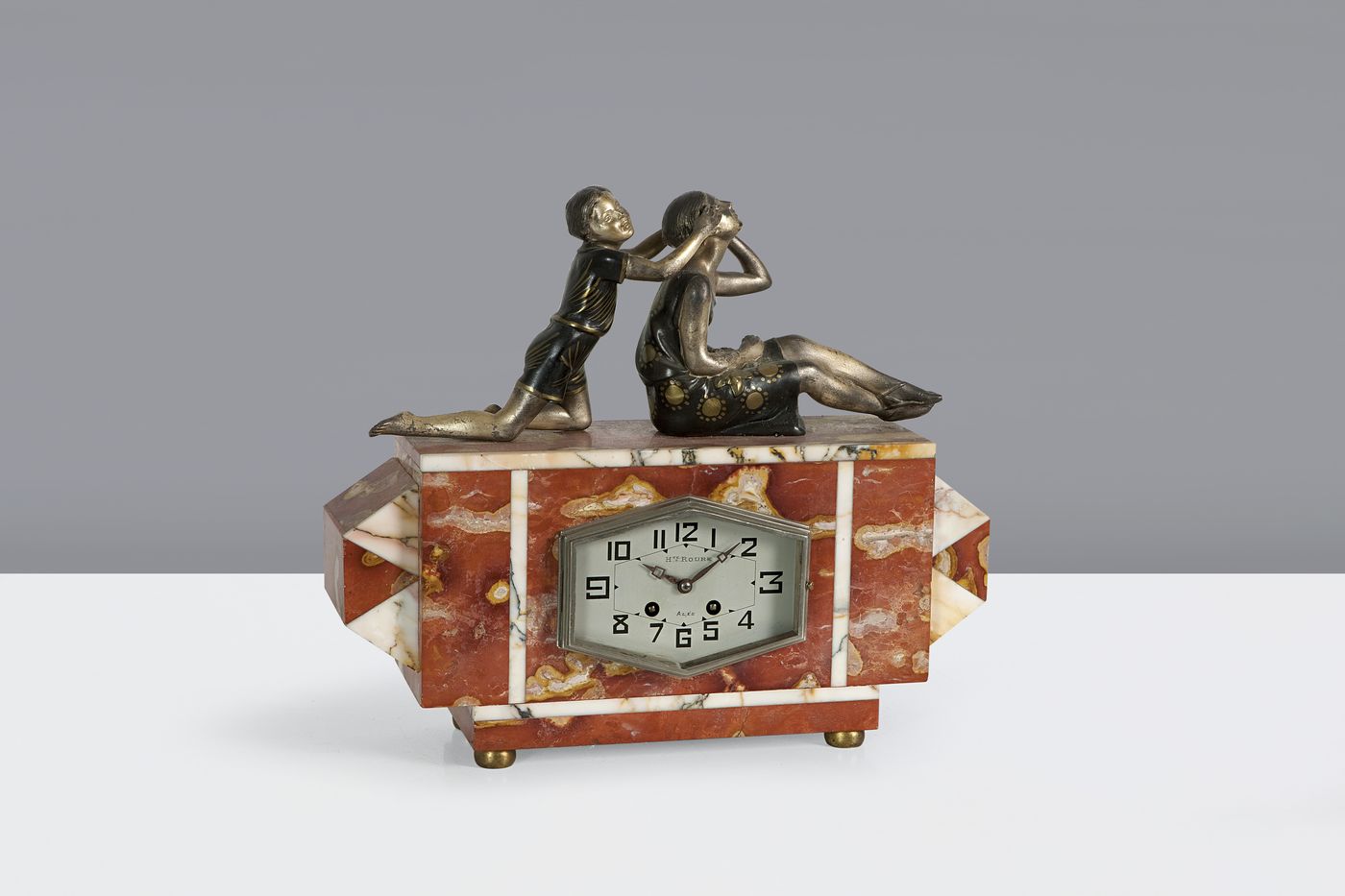 OROLOGIO Orologio Decò con figure di giovinetti in bronzo. Base in marmo,...