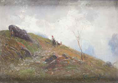 Ercole Garavaglia attivo in lombardia tra la fine del XIX e la metà del XX secolo PAESAGGIO COLLINARE olio su tela applicata su cartone pressato, cm 13,5x18,5. Firmato in basso a destra: E. Garavaglia