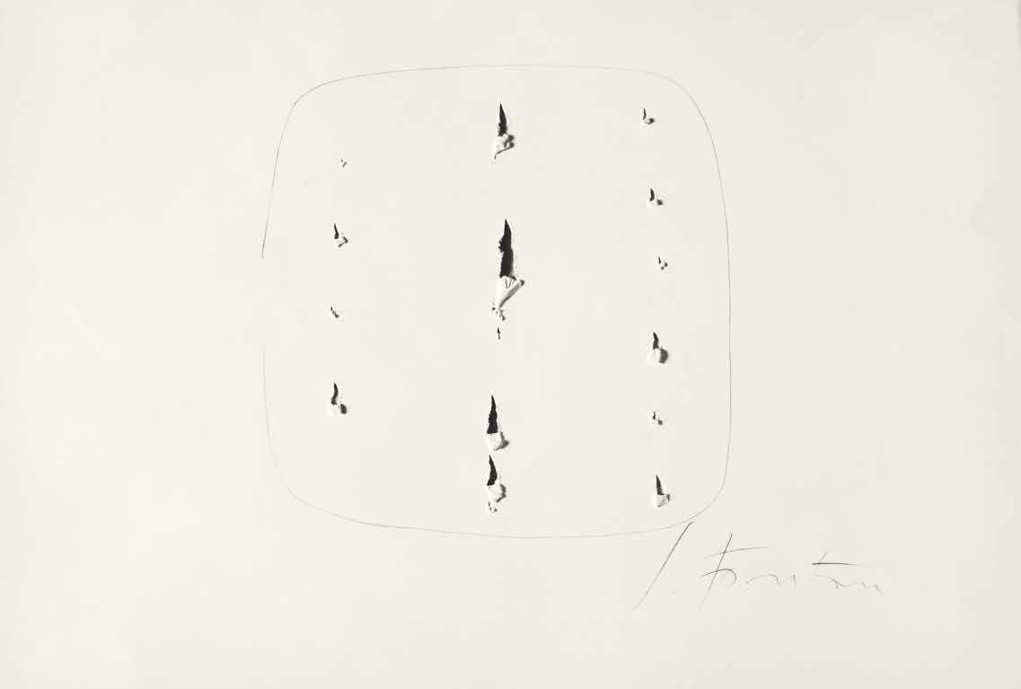 LUCIO FONTANA Rosario 1899 – Comabbio 1968 CONCETTO SPAZIALE, 1964/65 grafite e strappi su cartoncino, cm 31,8x46,6. Firmato in basso a destra: L Fontana Provenienza: Milano, Galleria Apollinaire (timbro al verso); Milano, collezione privata. L’opera è archiviata presso la Fondazione Lucio Fontana in Milano.
