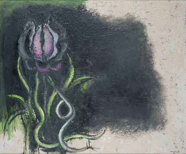 CARLO MATTIOLI Modena 1911 – Parma 1994 IL FIORE DE MALE, 1986 olio su tela, cm 100x120. Firmato in basso a destra: Mattioli Firmato al verso sulla tela: Mattioli Provenienza: Milano, Galleria d’Arte 32 (etichetta al verso sul telaio); Milano, collezione privata. Autentica su fotografia firmata dall’artista.