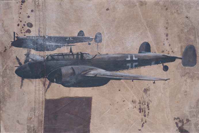 LUCA PIGNATELLI Milano 1962 AEREI, 2012 olio su telone di copertura vagone ferroviario, cm 42x63. Firmato, datato e titolato al verso: Luca Pignatelli Milano 2012 Aerei Autentica firmata dall’artista su fotografia.