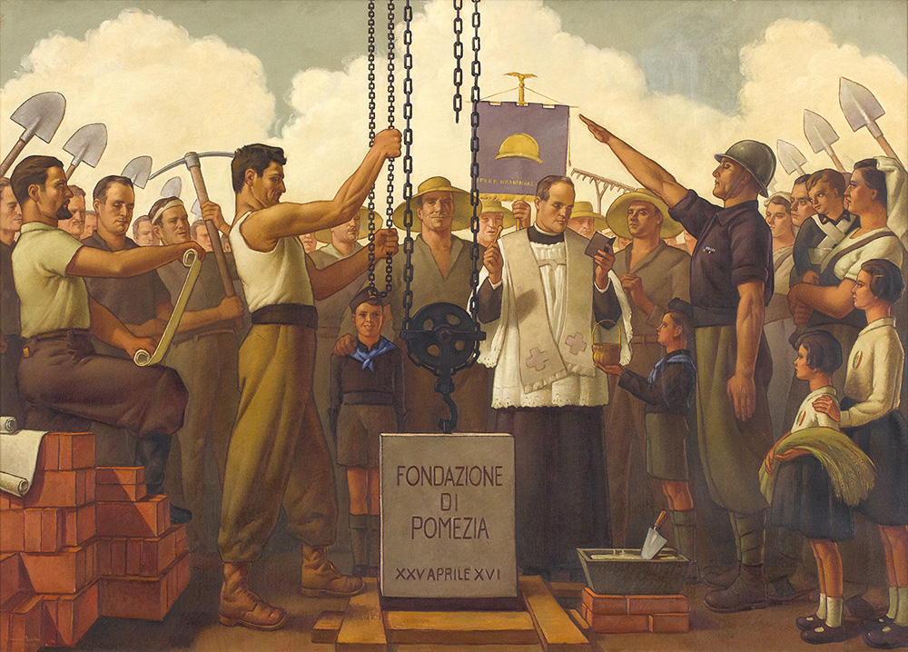 PIERO TESTA La fondazione di Pomezia, 1939 Olio su tela, 180 x 250 cm Firma e data in basso a sinistra: Pierino Testa, 1939 - XVII Etichetta al retro della mostra "Piero Testa, una vita per l'arte", Comune di Urbino, 1939 L’opera ha partecipato al Premio Cremona del 1939 PUBBLICAZIONI Piero Testa - Una vita per l’arte, a cura di S. Nava, Editrice Litostampa, Bergamo 1998, pp. 88 - 89 CONDITION REPORT Lievi restauri