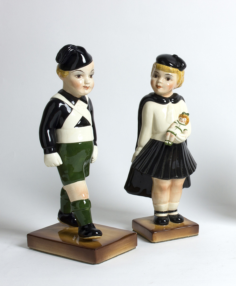ANTONIO ZEN Coppia di Giovani Balilla Sculture in ceramica dipinta, h 37 cm; h 35 cm Iniziali e marchio sotto la base: A.Z. / Nove CERAMICHE NOVE E BASSANO