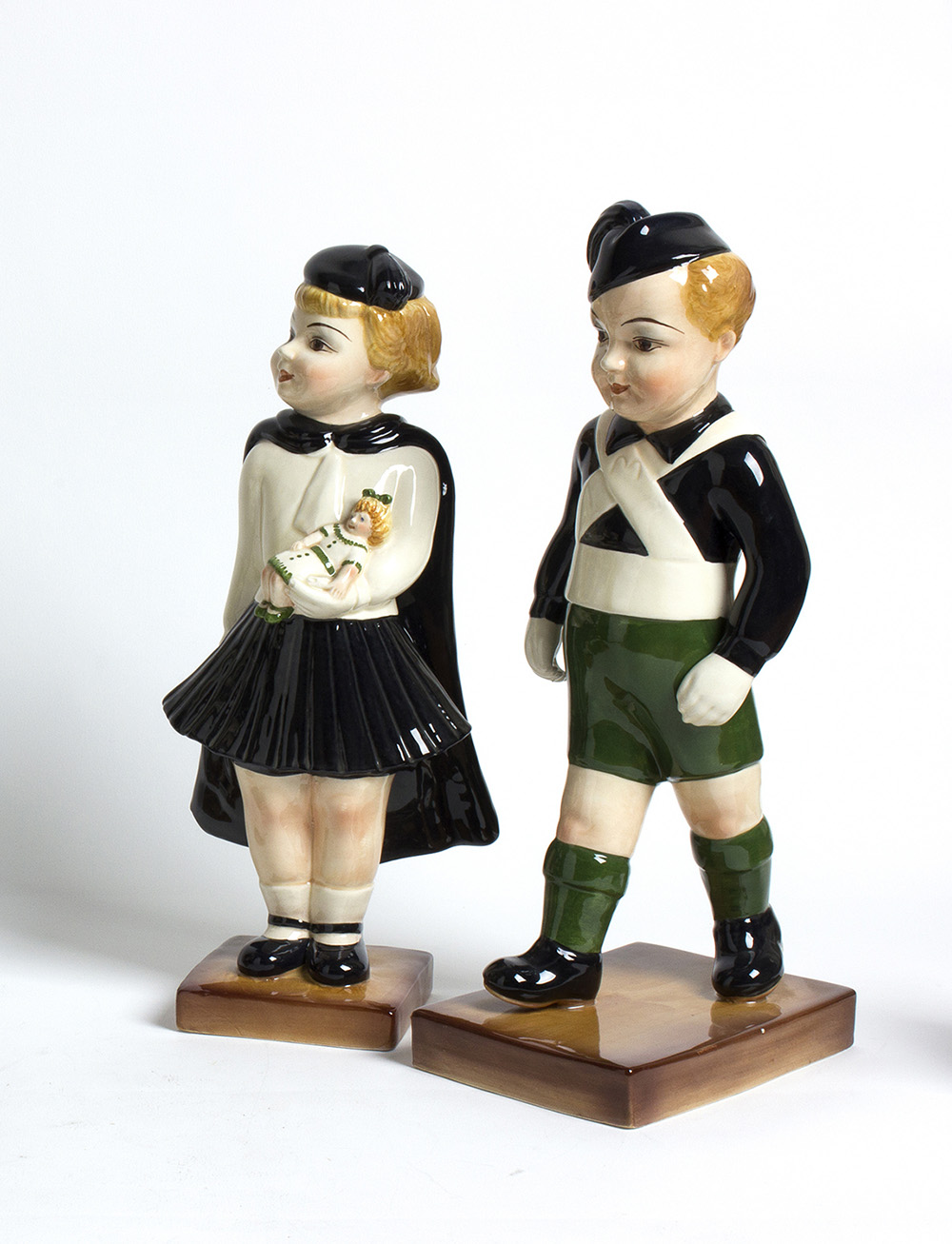 ANTONIO ZEN Coppia di Giovani Balilla Sculture in ceramica dipinta, h 37 cm; h 35 cm Iniziali e marchio sotto la base: A.Z. / Nove