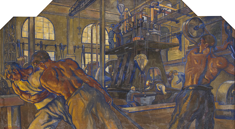 GIANNINO LAMBERTINI La Fabbrica Tempera su tela, 167 x 300 cm Firma in basso a sinistra: G. Lambertini CONDITION REPORT Restauri