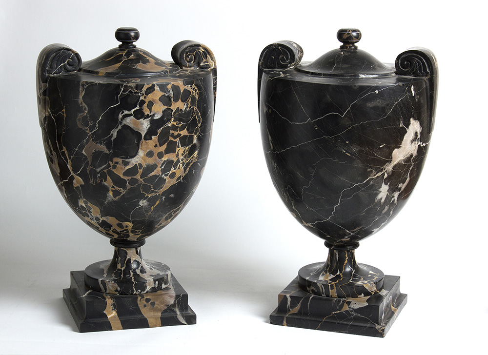 SCULTORE DEL XX SECOLO Coppia di vasi, Anni ‘30/’40 Marmo portoro, h 51 cm