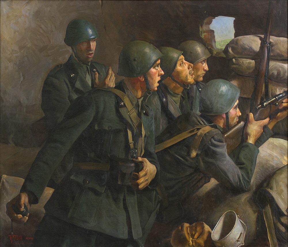 BRUNO AMADIO VINCERE E VINCEREMO Olio su tela, 120 x 140 cm Firma e data in basso a sinistra: Amadio XVIII Inscritto in basso a sinistra: 8° Regg. fant. Milano Inscritto al retro in alto a destra: La glorificazione del 6 -7 fanteria comandato dal Colonnello Vassarotti Cav. Giuseppe XVIII Etichetta in altro a sinistra dell'Unione Fascista - Professionisti ed Artisti, Bergamo