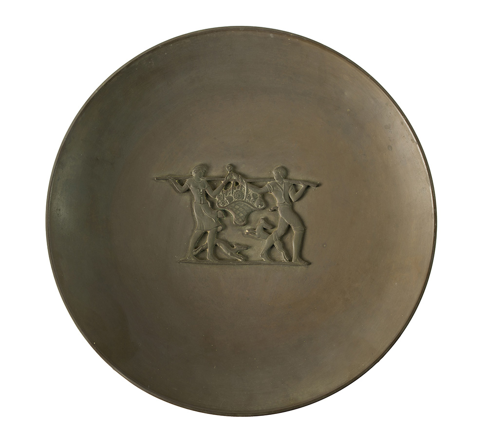 ANONIMO Grande piatto con figure in bassorilievo Metallo brunito, d 39,5 cm