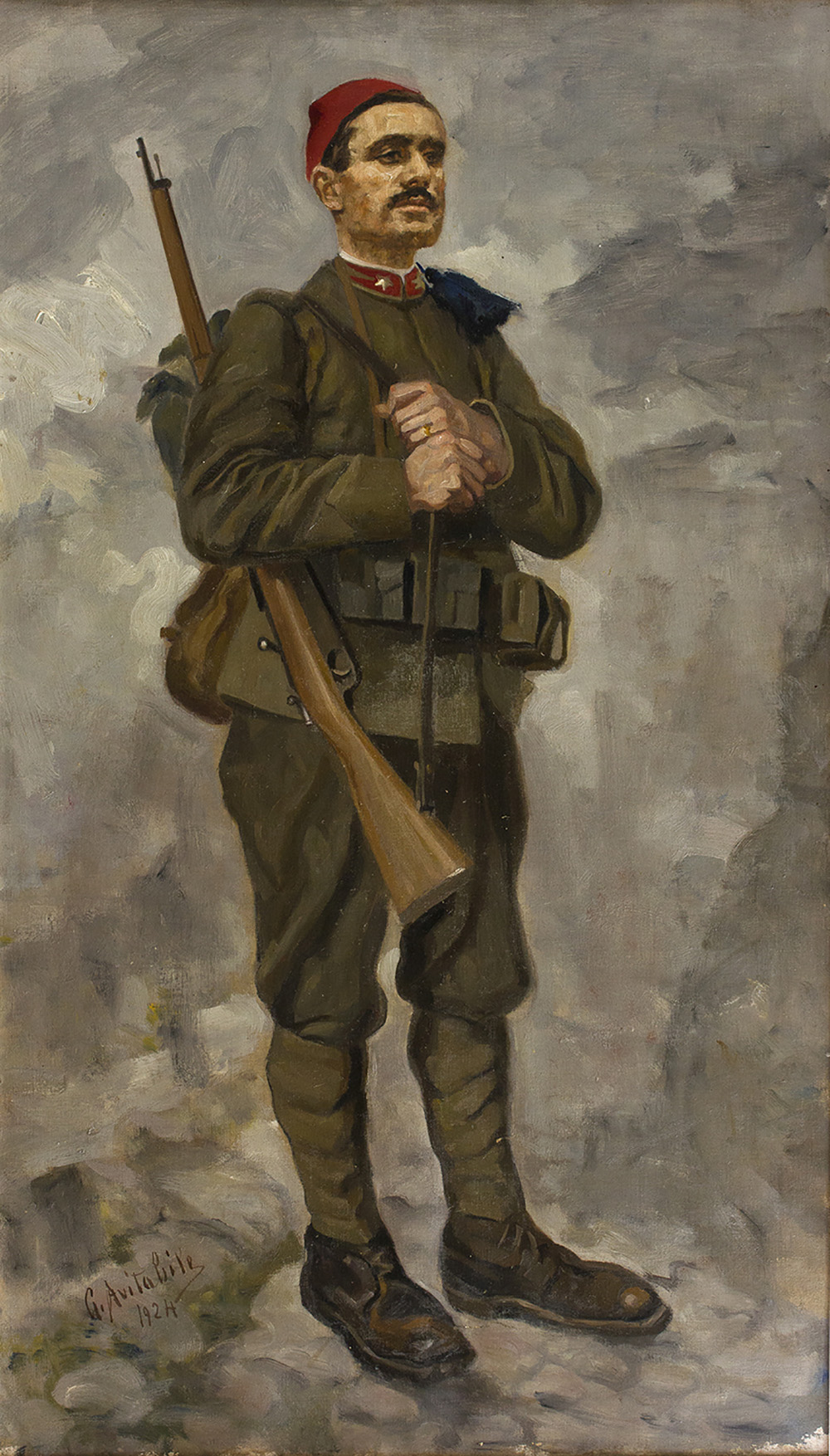 GIUSEPPE AVITABILE Soldato con moschetto, 1924 (Probabile ritratto del Duce da giovane) Olio su tela, 100 x 58 cm Firma e data in basso a sinistra: G.Avitabile, 1924 Dipinto al retro con “Mariage a la marin”